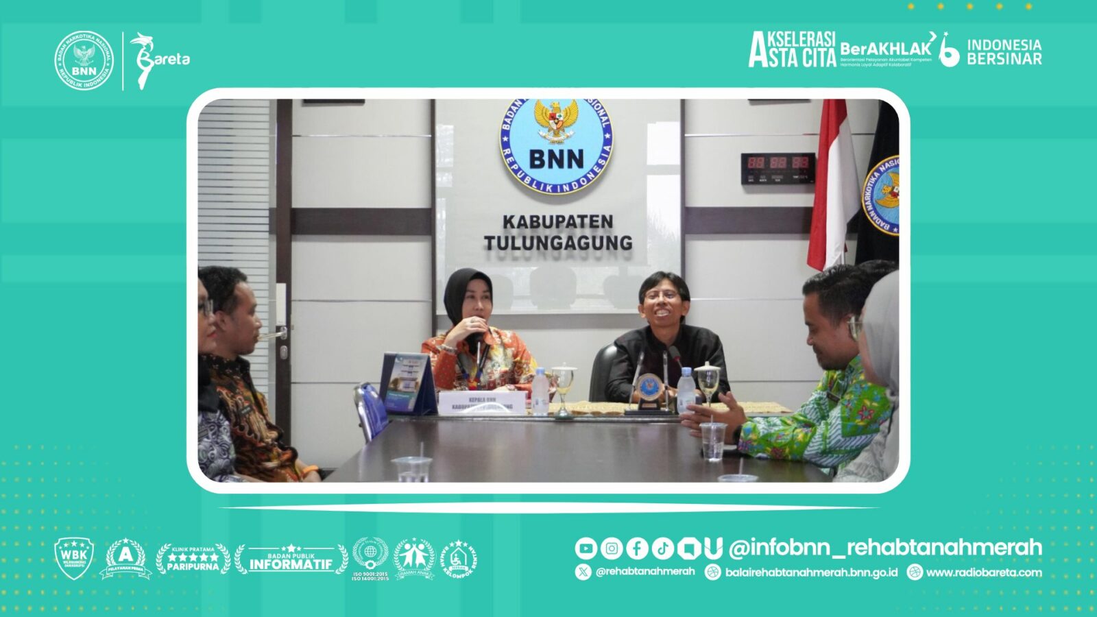 Balai Rehabilitasi BNN Tanah Merah sebagai unit kerja yang telah mendapatkan predikat Wilayah Bebas dari Korupsi memiliki tanggung jawab untuk memberikan pendampingan pada satuan kerja yang sedang melakukan pembangunan Zona Integritas, untuk itu, Kepala Sub Bagian Tata usaha yang juga sebagai Ketua Tim Pembangunan Zona Integritas Balai Rehabilitasi BNN Tanah Merah, Bapak Kanif Anshori, S.Pd.I memenuhi undangan dari Kepala BNN Kabupaten Tulungagung untuk memberikan asistensi secara langsung dalam membangun Zona Integritas. Dalam Pertemuan tersebut, Bapak Kanif Anshori, S.Pd.I menyampaikan gambaran dan strategi pembangunan Zona Integritas, juga kiat-kiat penyajian data, dan pembangunan inovasi yang harus berdampak pada core bisnis satuan kerja. Tak hanya itu, Fokus pembangunan 6 area Zona Integritas juga menjadi pembahasan dalam proses asistensi tersebut.