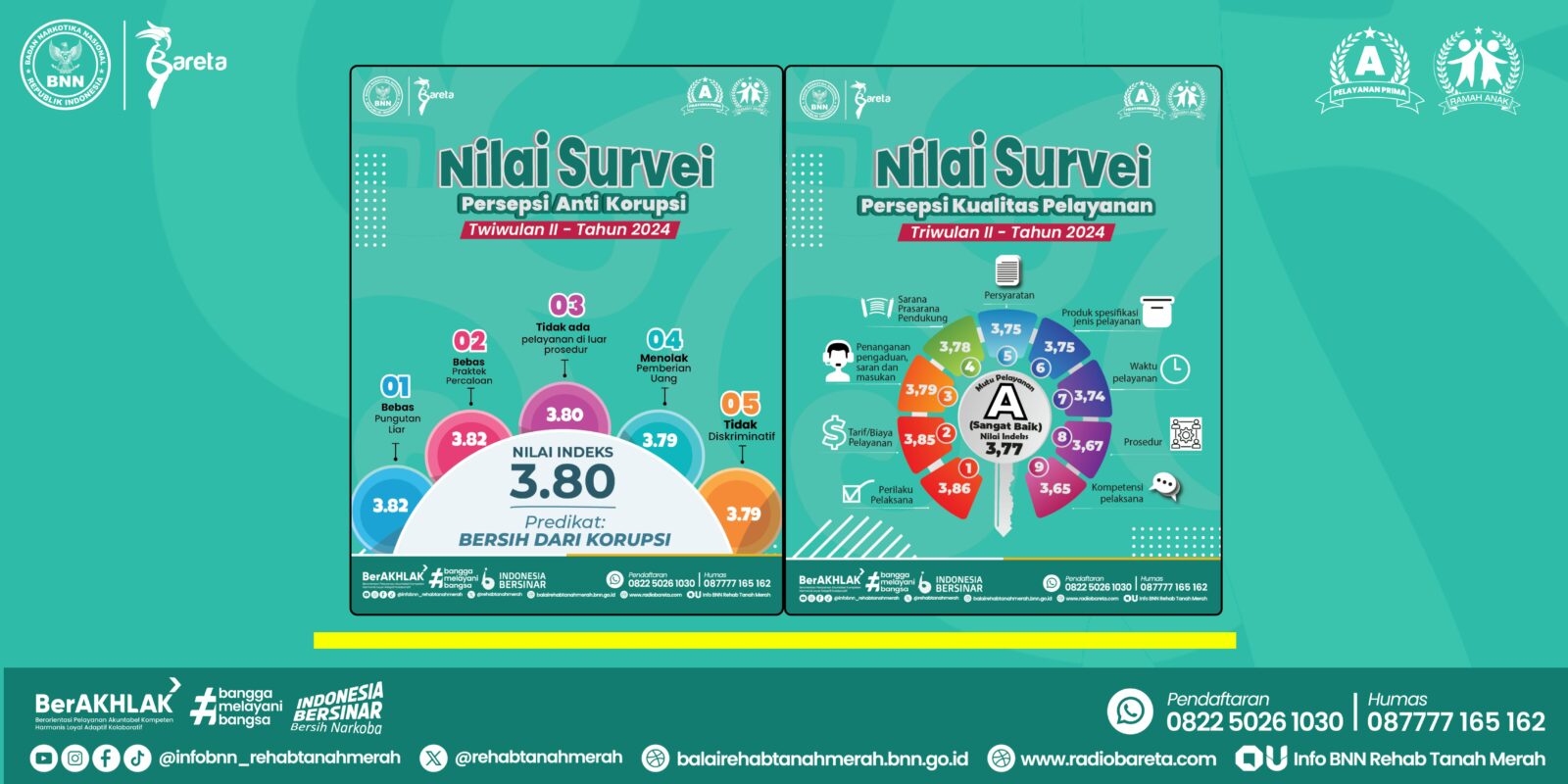 Sebagai salah satu unit pelaksana teknis bidang Rehabilitasi milik BNN RI yang berhasil meraih Penghargaan Penyelenggara Pelayanan Publik Kategori A dengan Predikat Pelayanan Prima dari Kementerian Pendayagunaan Aparatur Negara dan Reformasi Birokrasi Republik Indonesia, Balai Rehabilitasi BNN Tanah Merah terus berkomitmen menghadirkan transparansi dan akuntabilitas kami dengan mempublikasikan hasil Survei Persepsi Kualitas Pelayanan (SPKP) dan hasil Survei Persepsi Anti Korupsi (SPAK) Periode Triwulan II (April-Juni) Tahun 2024. Kami menyampaikan terima kasih atas kepercayaan anda kepada Balai Rehabilitasi BNN Tanah Merah sepanjang periode Triwulan II Tahun 2024. Mari terus bantu kami untuk memberikan pelayanan terbaik kepada anda. Sampaikan masukan, saran, kritik, maupun pengaduan anda, agar kami dapat terus menghadirkan pelayanan yang cepat, mudah, dan prima. (Humas Bareta, 2024)
