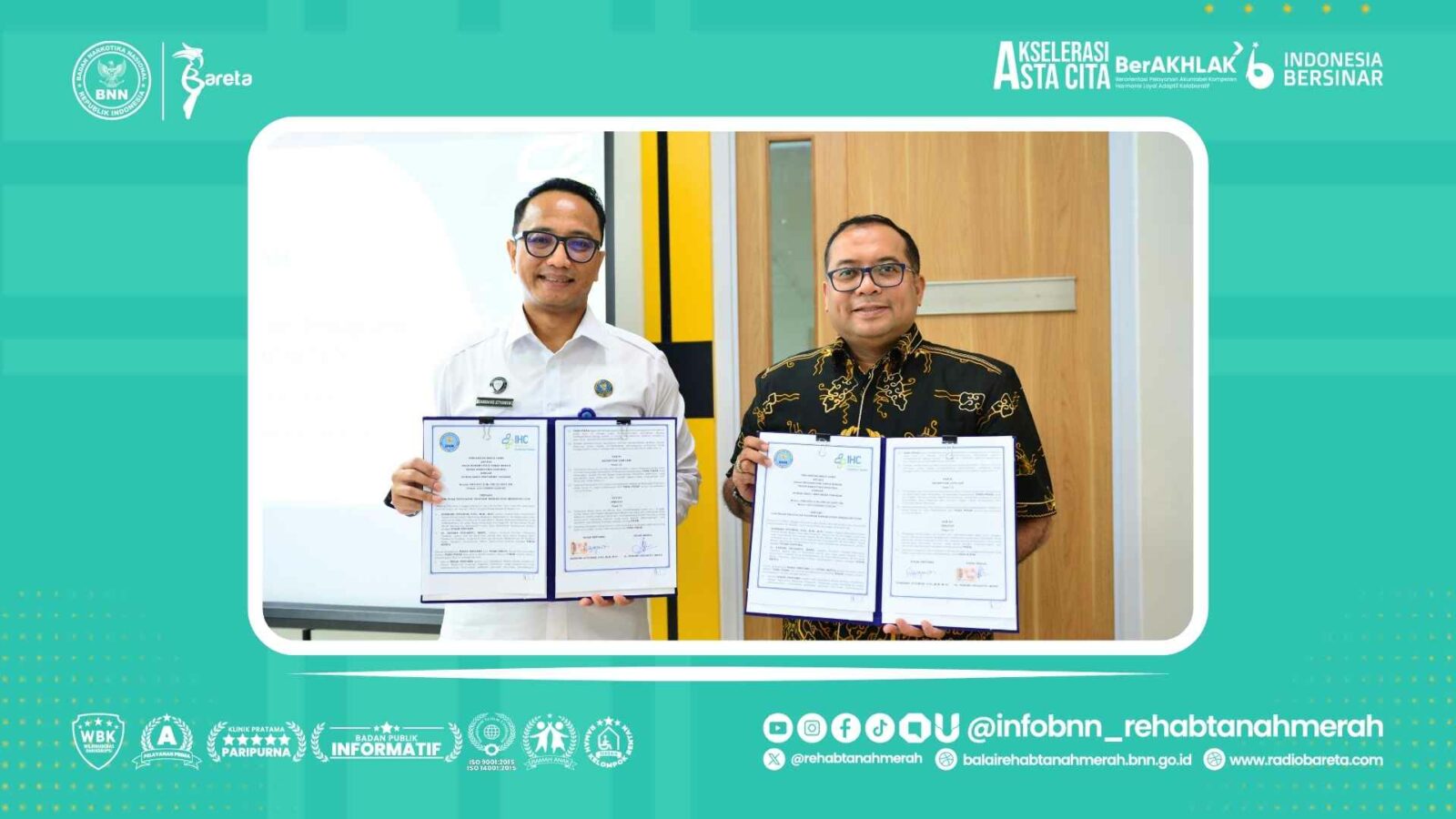 Kepala Balai Rehabilitasi BNN Tanah Merah, Bapak Bambang Styawan, S.Pd.,M.M.,M.Si melakukan penandatanganan Perjanjian Kerja Sama dengan Rumah Sakit Indonesia Healthcare Corporation (IHC) Pertamina Tarakan Kalimantan Utara. Penandatanganan kerja sama ini dilakukan untuk mendukung pelaksanaan rehabilitasi berkelanjutan. Adapun fokus utama dari kerja sama ini nantinya akan mendukung penguatan kompetensi sumber daya manusia yang memberikan layanan rehabilitasi, serta memfasilitasi dukungan layanan rehabilitasi berkelanjutan yang akan dikerjakan kedua lembaga. Direktur Utama Rumah Sakit IHC Pertamina Tarakan, dr. Nanang Sugiarto, MARS dalam sambutannya menyampaikan pihaknya siap mendukung pelaksanaan rawatan bagi penyalahguna Napza, komitmen tersebut diwujudkan dengan dibangunnya fasilitas rawatan bagi penyalahguna Napza di Rumah Sakit IHC Pertamina Tarakan. Saat ini fasilitas tersebut dalam proses pembangunan dan kedepannya akan siap untuk melayani rawatan bagi penyalahguna Napza dengan fasilitas yang sangat modern sesuai dengan standar rawatan IHC Pertamina.