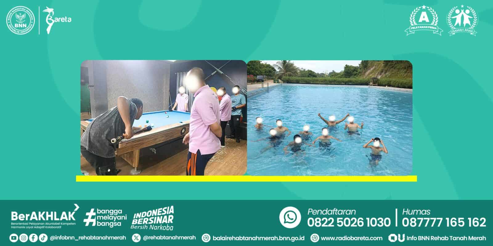 Pada Activity outside kali ini, Balai Rehabilitasi BNN Tanah Merah mengajak para klien untuk mengikuti activity outside dengan berenang di Kolam Renang Kebun Ndesa Samarinda dan permainan billiard di Ilham Jaya Breakshot Cafe & Billiard. Kegiatan activity outside kali ini diikuti oleh klien dari program Primary Male dan Re-Entry serta didampingi oleh staff Balai Rehabilitasi BNN Tanah Merah. Melalui kegiatan ini, klien diharapkan terjadi penyegaran semangat dalam menjalani program rehabilitasi. (Humas Bareta, 2024)