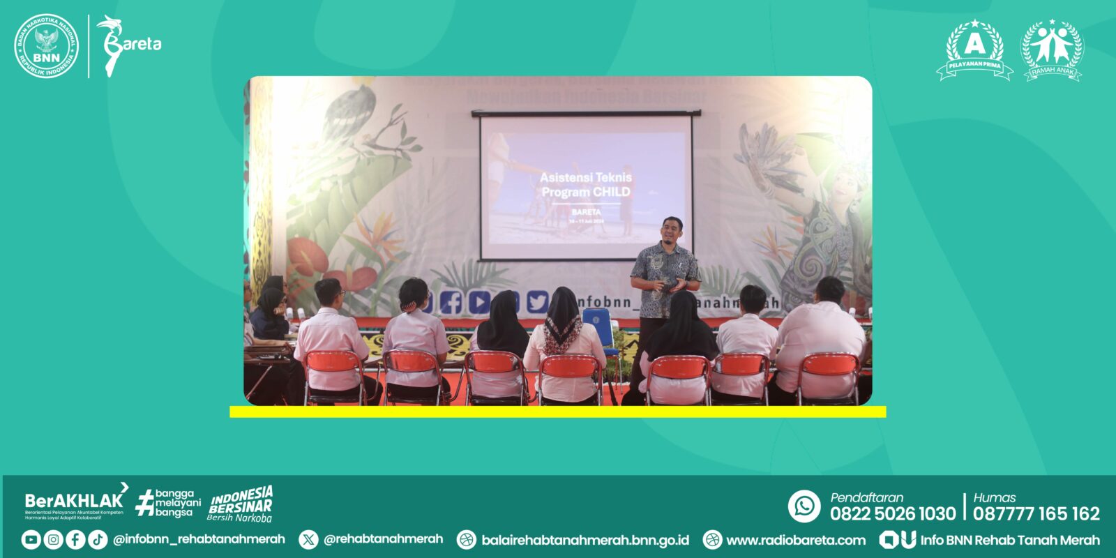 Direktorat Penguatan Lembaga Rehabilitasi Instansi Pemerintah (PLRIP) Badan Narkotika Nasional Republik Indonesia (BNN RI) bekerja sama dengan Drug Advisory Programme (DAP) menyelenggarakan kegiatan asistensi teknis program CHILD pada anak penyalahguna narkoba di Balai Rehabilitasi BNN Tanah Merah. Hadir sebagai pembicara, Bapak Erry didampingi oleh Bapak Anto Soelistyo dari Direktorat PLRIP. Kegiatan pada hari pertama ini dibuka secara langsung oleh Kepala Balai Rehabilitasi BNN Tanah Merah, Bapak Drs. Sutarso, S.H., M.Sc. Kegiatan ini diisi langsung oleh Bapak Erry Wijoyo, M.Psi. T dari Colombo Plan DAP. Menurut rencana kegiatan ini akan berlangsung dari tanggal 10-12 Juli 2024 di Gedung Serbaguna Balai Rehabilitasi BNN Tanah Merah. (Humas Bareta, 2024).