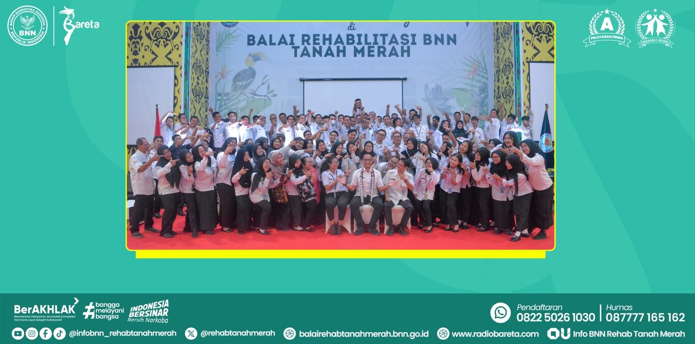 Bertempat di Gedung Serbaguna Balai Rehabilitasi BNN Tanah Merah, sebanyak 144 Pegawai Bareta menyambut kehadiran Kepala Balai Rehabilitasi BNN Tanah Merah yang baru yaitu Bapak Bambang Styawan, S.Pd., M.M., M.Si. Acara yang mengusung tema Kenal Sambut Kepala Bareta ini diisi dengan berbagai kegiatan seperti sambutan dari Kepala Sub Bagian Tata Usaha, Bapak Kanif Anshori, S.Pd.I, prakata dan pengarahan dari Kepala Bareta, penampilan Bareta Band, pemotongan Tumpeng sebagai rasa syukur bersama seluruh pegawai atas kehadiran Kepala Balai yang baru. Kepala Sub Bagian Tata Usaha, Bapak Kanif Anshori, S.Pd.I dalam sambutannya menyampaikan bahwa seluruh pegawai Bareta siap berjalan dan bersinergi bersama Kepala Bareta untuk menghadirkan kualitas Bareta yang lebih baik.