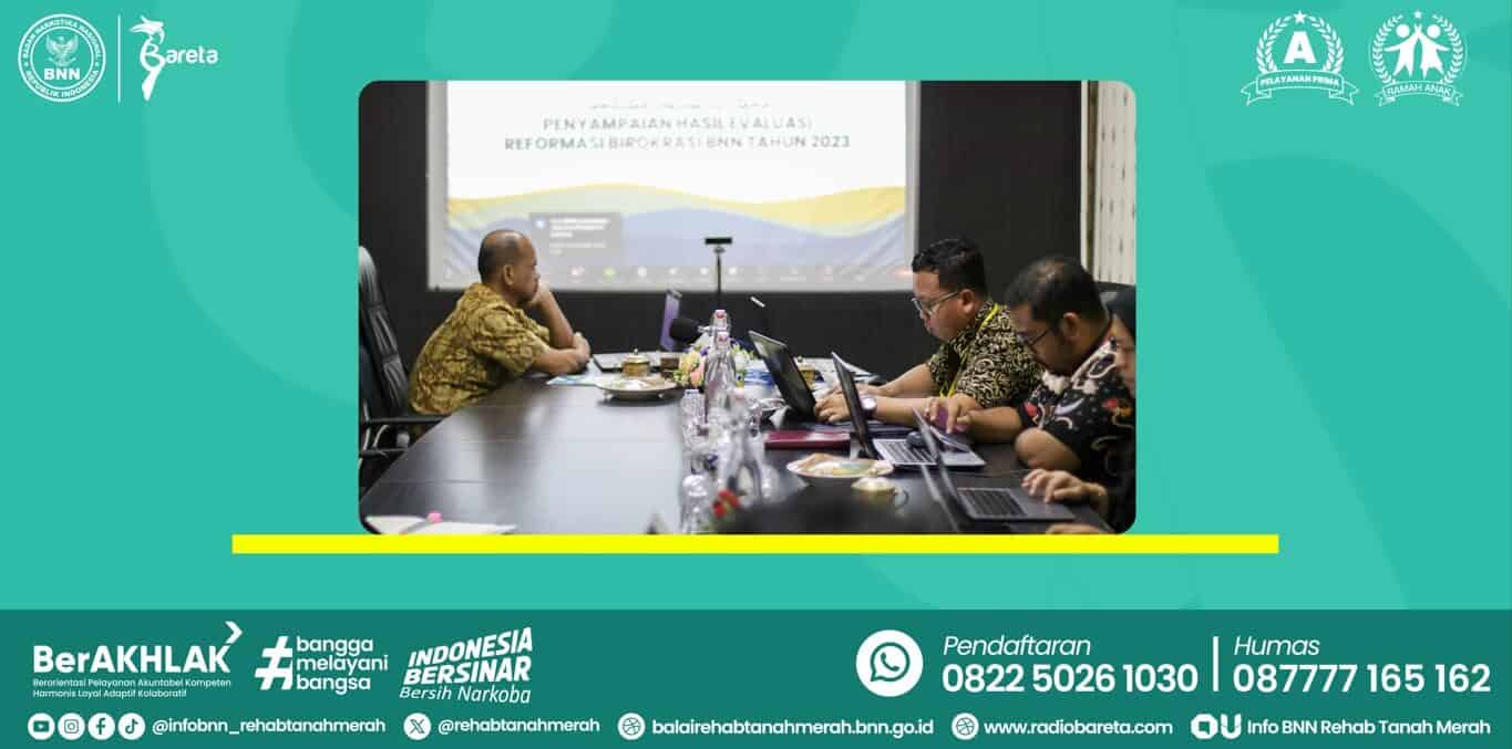 Kepala Balai Rehabilitasi BNN Tanah Merah, Bapak Drs. Sutarso, S.H., M.Sc bersama Tim Pembangunan Zona Integritas menghadiri Rapat Penyampaian Hasil Evaluasi Reformasi Birokrasi Badan Narkotika Nasional Republik Indonesia Tahun 2023 secara daring. Kegiatan ini menghadirkan pembicara dari Kementerian Pendayagunaan Aparatur Negara dan Reformasi Birokrasi (Kemen-PANRB) yang secara detail menyampaikan capaian indeks reformasi birokrasi general maupun tematik dari Badan Narkotika Nasional Republik Indonesia. Secara keseluruhan penyelenggaraan Reformasi Birokrasi Badan Narkotika Nasional Republik Indonesia berhasil meraih kategori Sangat Baik. Kedepannya, upaya reformasi birokrasi di Badan Narkotika Nasional Republik Indonesia akan terus ditingkatkan sehingga dapat meningkatkan capaian reformasi birokrasi dan Balai Rehabilitasi BNN Tanah Merah sebagai salah satu unit pelaksana teknis bidang rehabilitasi juga berkomitmen untuk mendukung upaya reformasi birokrasi Badan Narkotika Nasional Republik Indonesia dengan komitmen pembangunan Zona Integritas yang lebih baik. (Humas Bareta, 2024)