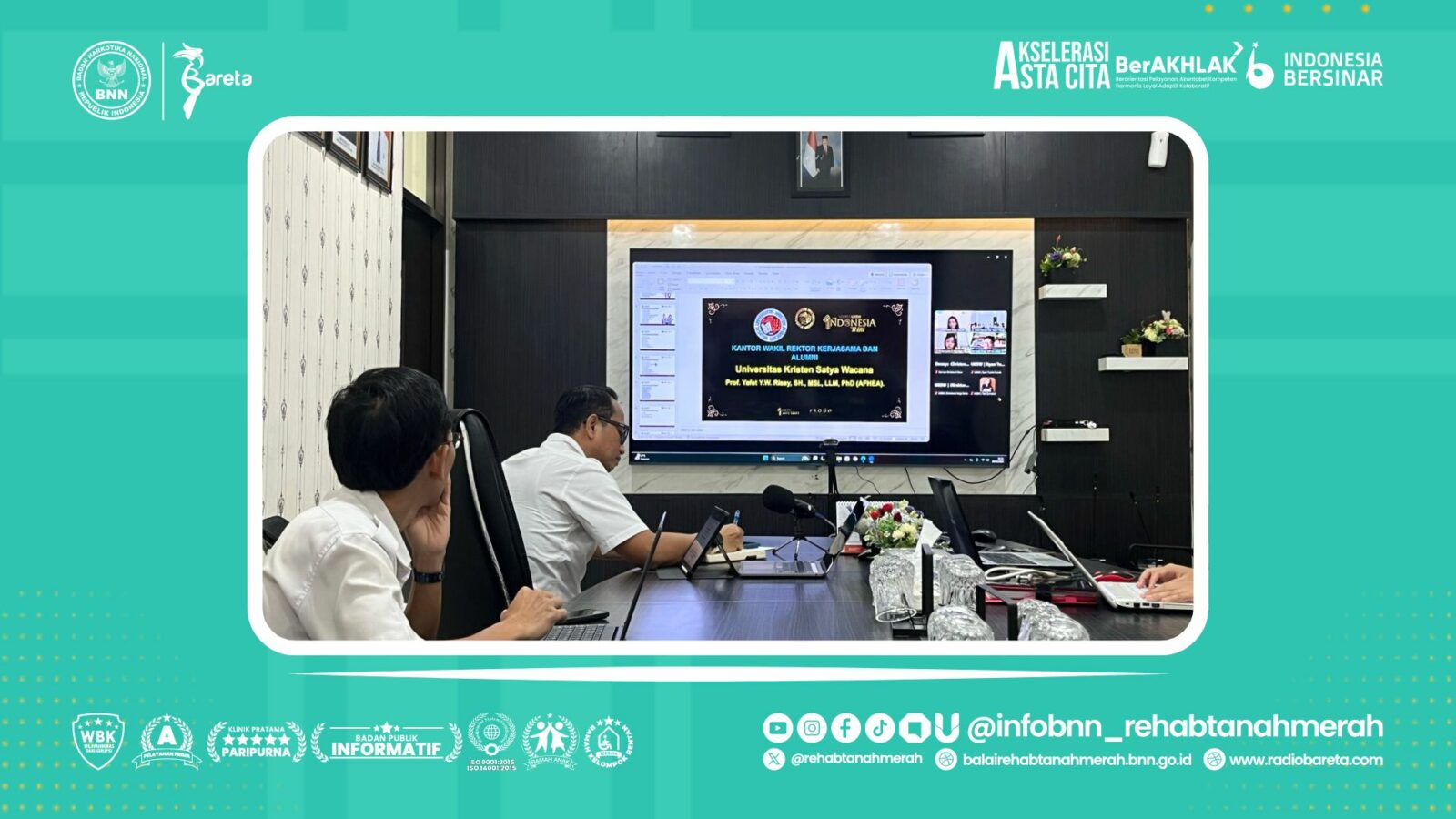 Kepala Balai Rehabilitasi BNN Tanah Merah, Bapak Bambang Styawan, S.Pd.,M.M.,M.Si didampingi Kepala Sub Bagian Tata usaha, Bapak Kanif Anshori, S.Pd.I, bersama Pj. Kepegawaian Bro Chandra, Tim Humas dan Kerjasama, beserta perwakilan pegawai, hadir dalam audiensi virtual bersama Universitas Kristen Satya Wacana Salatiga-Jawa Tengah. Audiensi virtual tersebut diterima langsung oleh Wakil Rektor Bidang Kerjasama dan Kealumnian UKSW Prof. Yafet Yosafet Wilben Rissy, S.H., M.Si., LLM, Ph.D. (AFHEA) bersama Direktur Direktorat Kerjasama UKSW Dr. Dian Toar Y. Getroidester Sumakul, S.Pd, M.A. Adapun dalam Audiensi Virtual tersebut, berbagai potensi kerjasama diantara kedua pihak dibahas secara bersama-sama sebagai upaya meningkatkan sinergitas antara Balai Rehablitasi BNN Tanah Merah dan UKSW Salatiga.