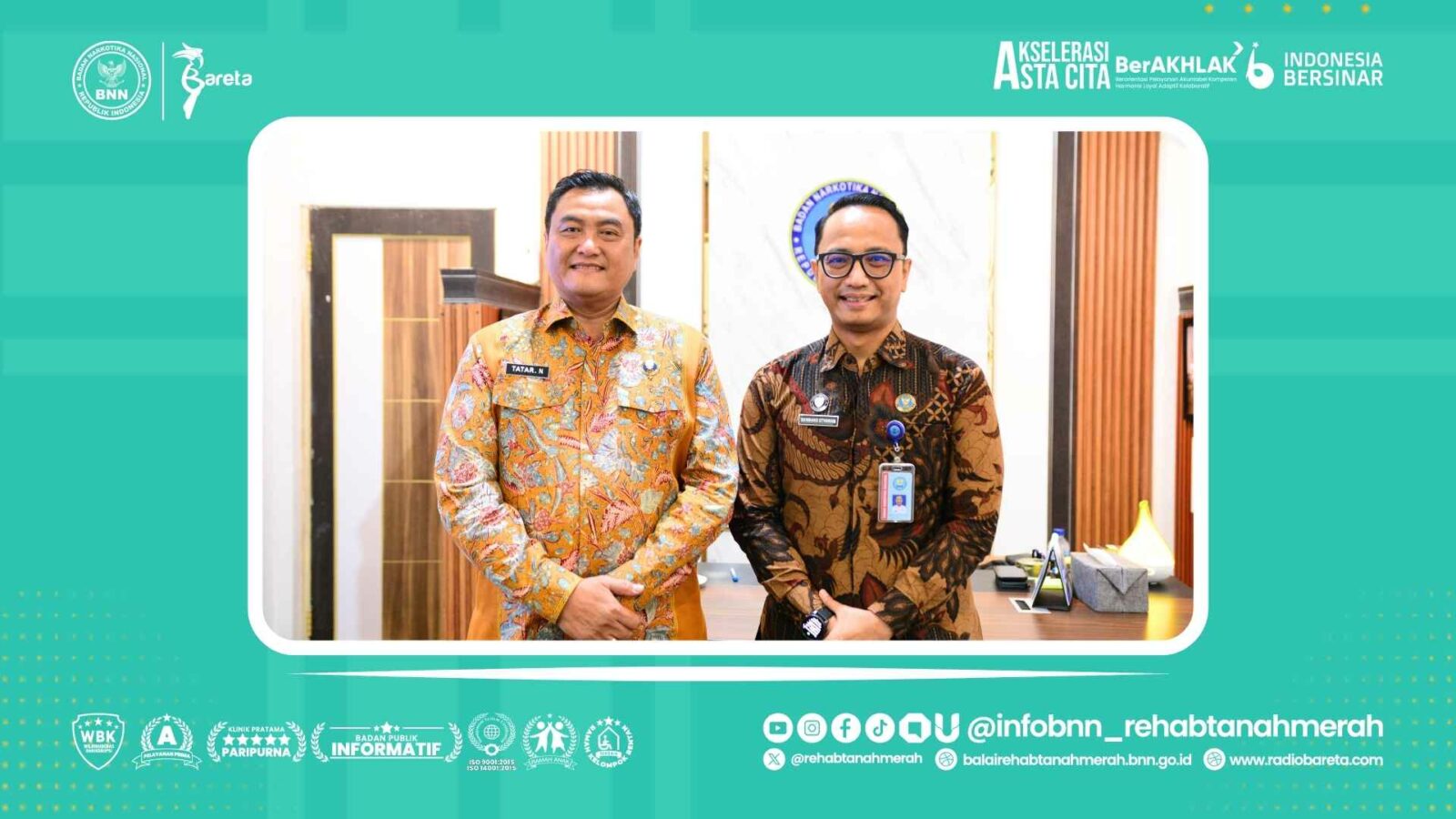 Kepala Balai Rehabilitasi BNN Tanah Merah, Bapak Bambang Styawan, S.Pd., M.M., M.Si., bersama Tim dari Bareta, melakukan kunjungan kerja di BNN Provinsi Kalimantan Utara. Kunjungan tersebut disambut langsung oleh Kepala BNNP Kalimantan Utara, Brigjen Pol. Tatar Nugroho, S.I.K., S.H. beserta jajaran. Pada pertemuan strategis tersebut, Kepala Balai Rehabilitasi BNN Tanah Merah bersama Kepala BNNP Kalimantan Utara membahas penguatan sinergitas antara kedua pihak dalam mendukung program rehabilitasi sebagai bagian dari upaya komprehensif penanganan penyalahgunaan narkotika termasuk menggandeng layanan kesehatan milik pemerintah maupun swasta untuk optimalisasi sinergitas tersebut.  Sebagaimana diketahui, Kalimantan Utara merupakan salah satu wilayah dengan potensi tinggi sebagai jalur masuk peredaran gelap narkoba, sehingga angka penyalahgunaan pun tergolong tinggi.