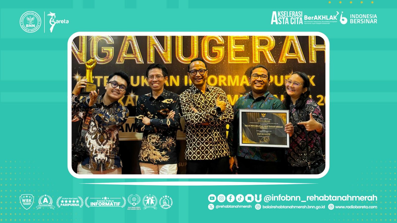 Balai Rehabilitasi BNN Tanah Merah kembali meraih Peringkat 1 Badan Publik Informatif kategori Instansi Vertikal Pusat di Kalimantan Timur dari Komisi Informasi (KI) Kaltim dalam Malam Penganugerahan Keterbukaan Informasi Publik Tahun 2025. Capaian ini bukan sekadar piala, tetapi bukti nyata komitmen kami: